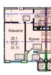 Общая площадь 51,11 кв. м: кухня 121 кв. м, комната 20,1 кв. м, санузел 5,3 кв. м, прихожая 9,7 кв. м.