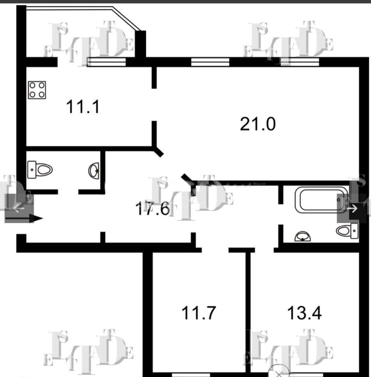 кухня 12 кв.м, 3 окремі кімнати, 1 балкон, 2 санвузла, передпокій.