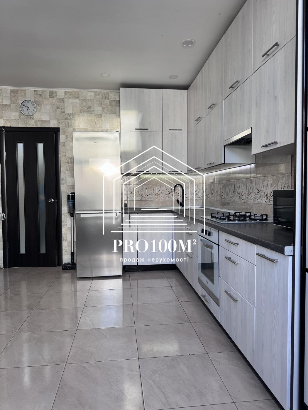 Сучасний холодильник, посудомийна машина, газова варильна поверхня, духова шафа, витяжка, камʼяна мийка, велика вбудована шафа.