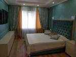На другому поверсі спальня з виходом на лоджією з підігрівом. Яскраве колірне рішення стін мармуру кольору Тіффані, багато шафок, шафа гармошка під онікс. Вид з вікна на озеро.