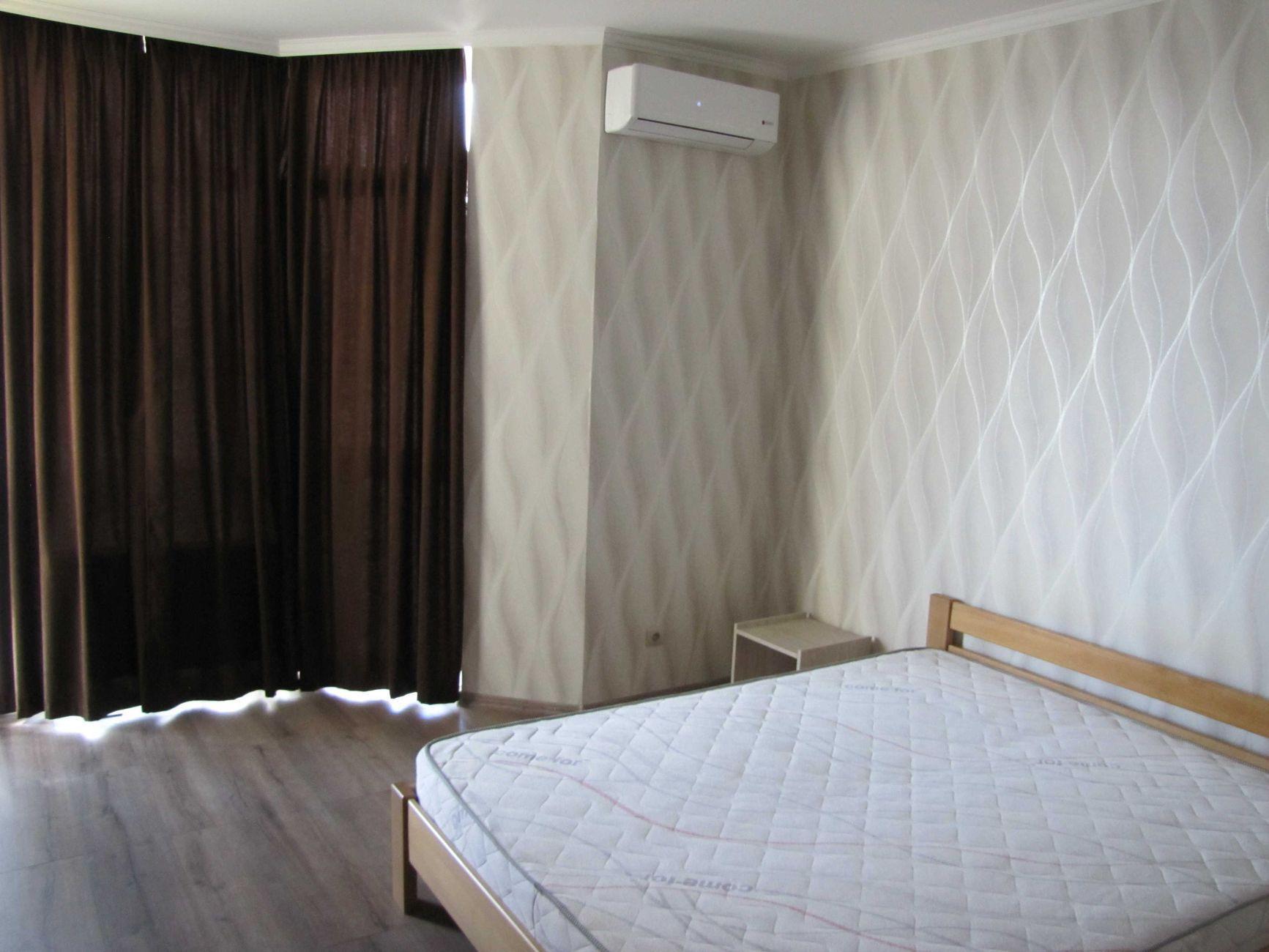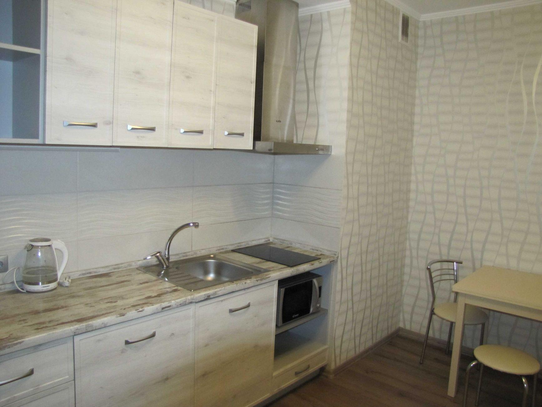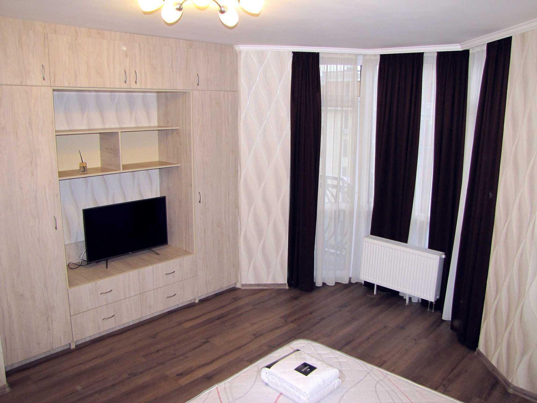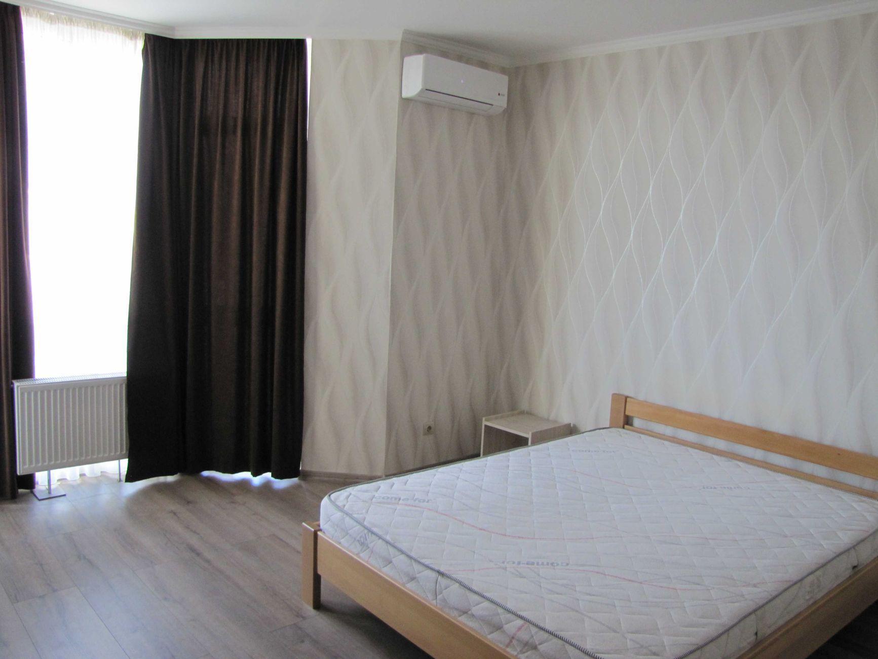 1-кімнатна квартира (не студія) з великою кімнатою (20м2) та окремою кухнею 14 м2. Новий будинок з власною закритою територією. Дитячий майданчик та автомобільний паркінг з автоматичними воротами доступу. На вході консьєрж та відео нагляд. Квартира розташована в центрі будинку. Вікна квартири виходять в тихий двір. В кімнаті панорамне вікно і вихід на балкон. Сучасні меблі – вбудована шафа та двоспальне ліжко з натурального дерева з якісним двостороннім ортопедичним матросом, телевізор, кондиціонер. Простора кухня з заскленою лоджією. На кухні є меблі з вбудованою технікою. Зроблене робоче місце для IT. Є можливість розмістити диван. В ванній кімнаті розміщена повноцінна чавунна ванна, бойлер з програмним регулюванням температури води, пральна машина. Зручне розташування. Поруч ринок, магазини, аптеки, банки, кафе.