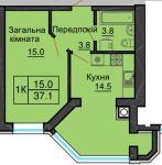 кухня 14,8 кв.м, 1 окрема кімната, 1 лоджія, 1 суміжний санвузол, передпокій.