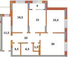 Загальна площа - 105,5 кв.м: кухня-вітальня 20 кв.м, 3 окремі кімнати (15 кв.м, 16,5 кв.м та 15,5 кв.м), лоджія, 2 санвузли, передпокій, гардеробна.