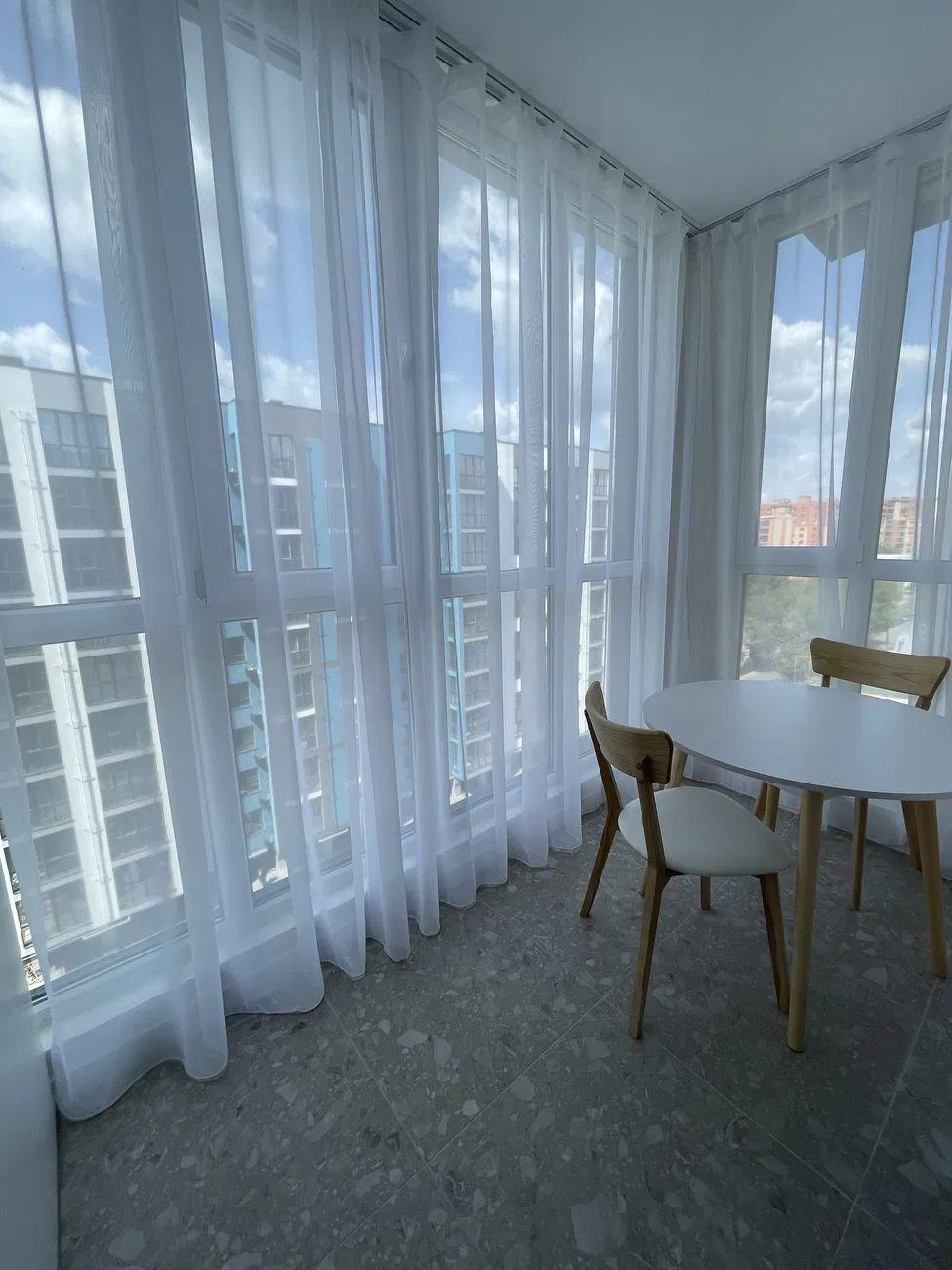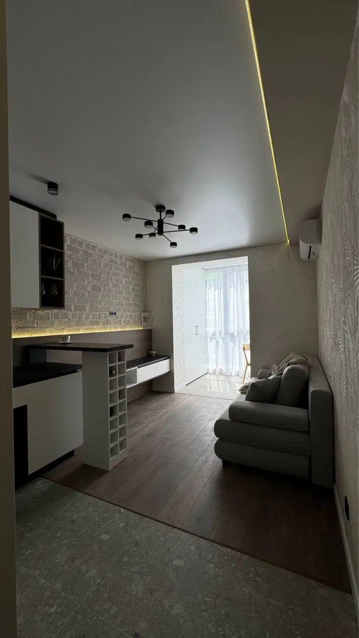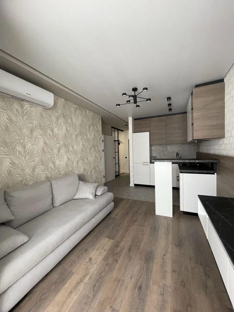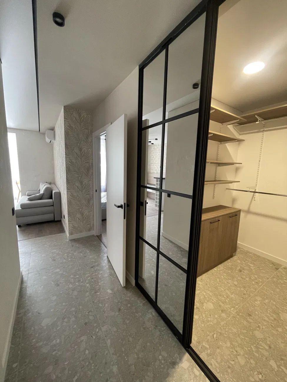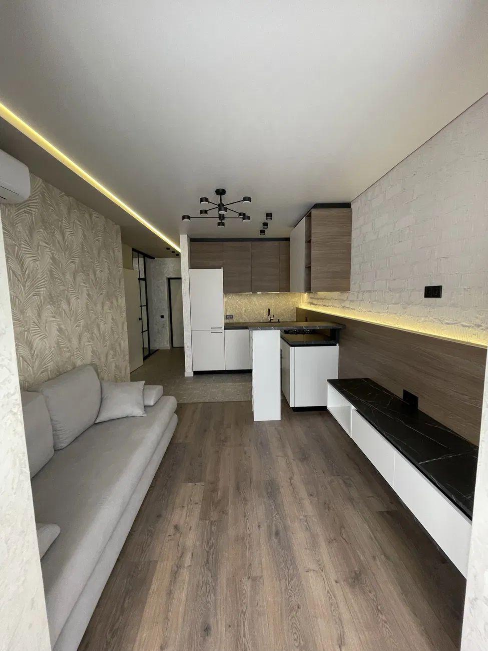 Загальна площа – 44 кв.м.: кухня вітальня 12 кв.м., 1 окрема кімната, 1 санвузол, гардеробна, лоджія на кухні.