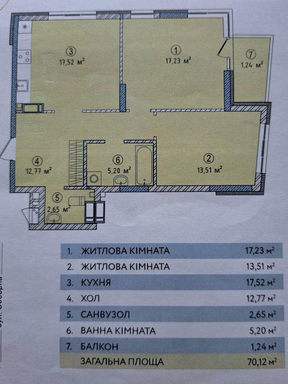 Загальна площа - 70,1 кв.м., кухня 17.5 кв.м, 2 кімнати, хол, санвузол, ванна кімната, балкон
