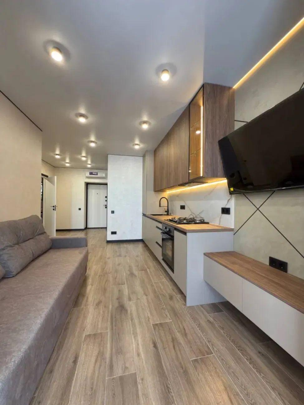 Загальна площа – 45 кв.м.: кухня вітальня 17 кв.м., 1 окрема кімната, суміжний санвузол, гардеробна, лоджія.
