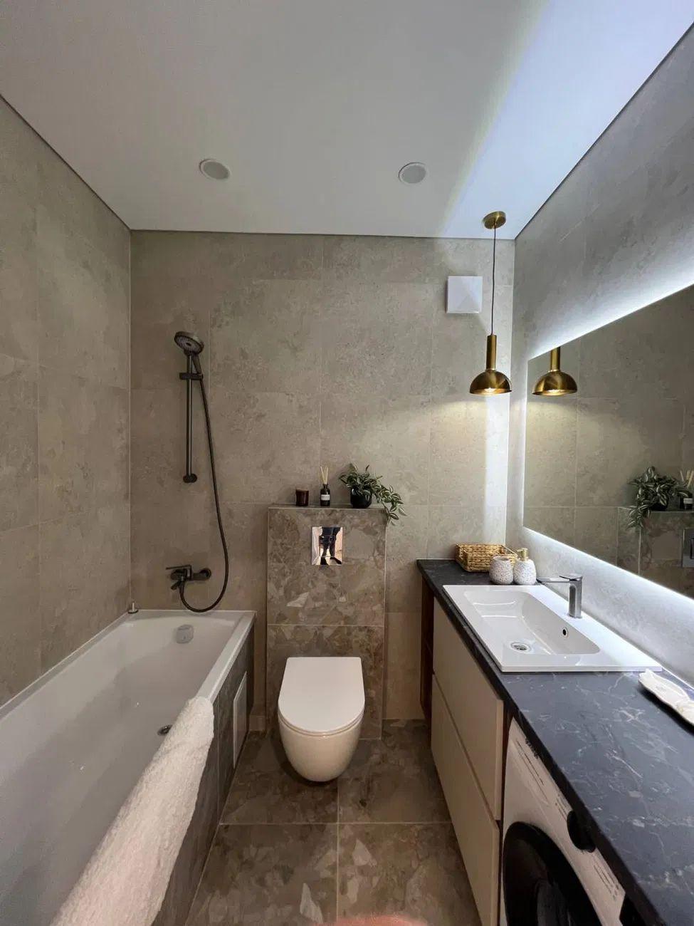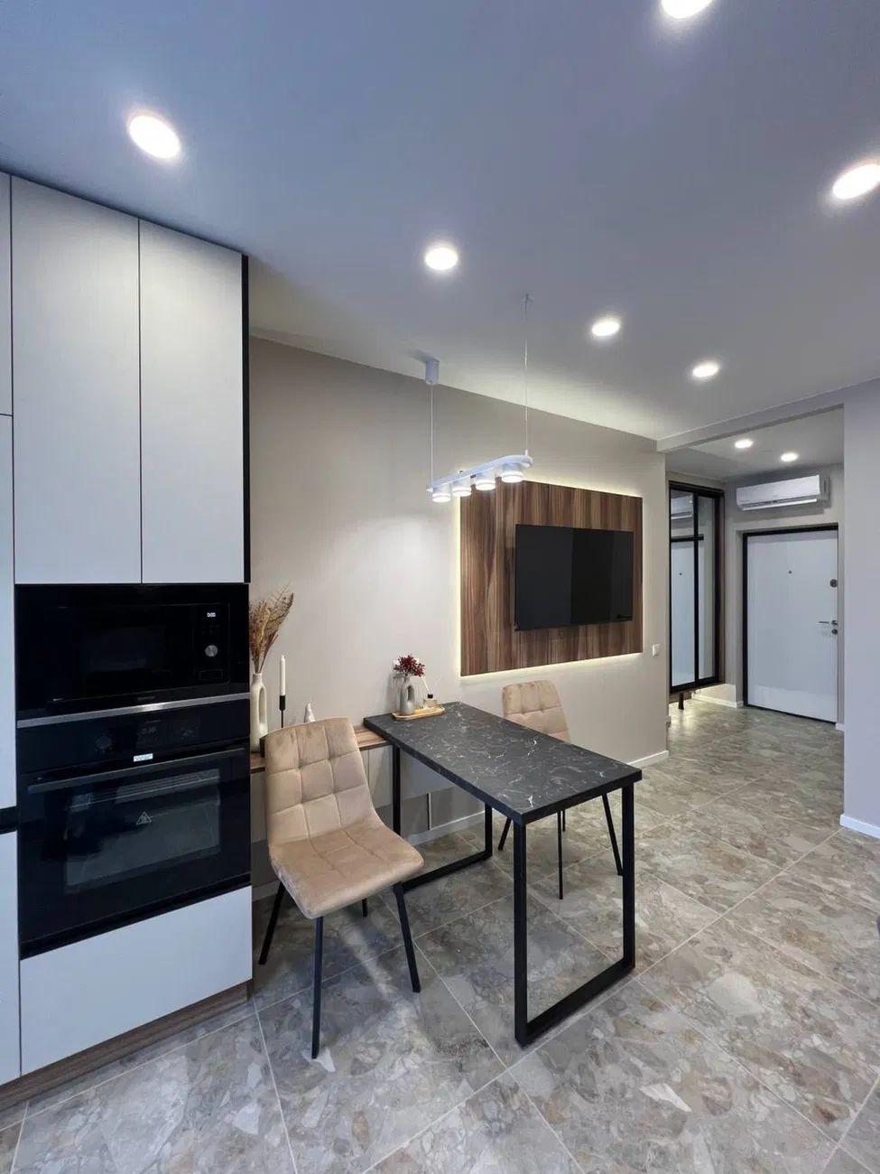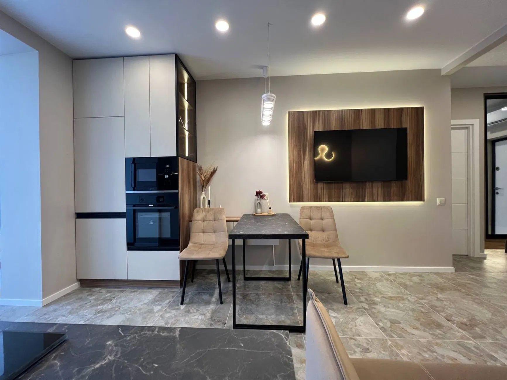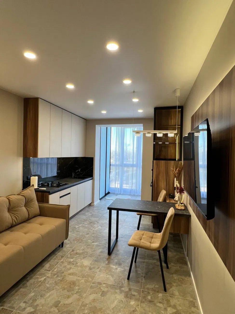Загальна площа – 45 кв.м.: кухня вітальня 18 кв.м., 1 окрема кімната, 1 санвузол, гардеробна, лоджія.