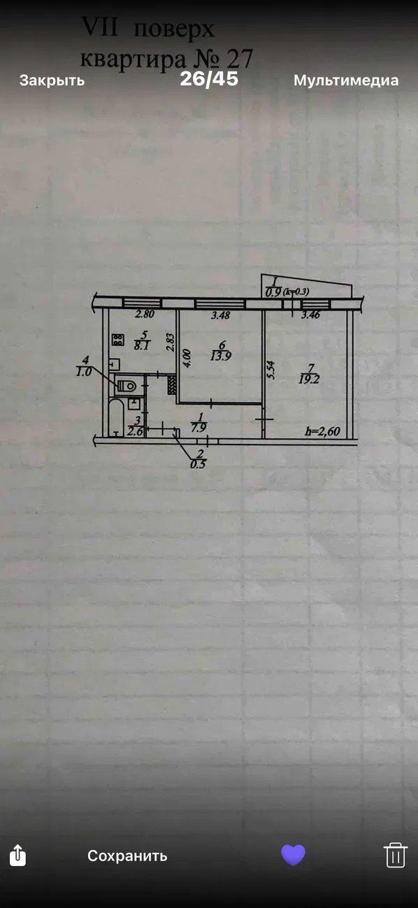Загальна площа - 55 кв.м: кухня 8кв.м, 2 окремі кімнати, суміжний санвузол, балкон, вікна дерев'яні.