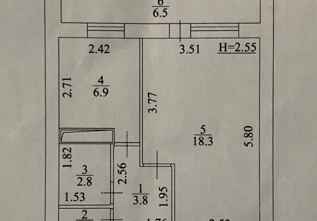 Загальна площа - 39,4 кв.м., кухня 6,9 кв.м, кімната 18,3 кв.м., санвузол. Великий, засклений балкон, комора (кладовая).