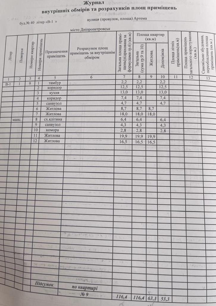 Загальна площа - 116.4 кв.м.: кухня - 13 кв.м, 4 окремі кімнати, 2 санвузли, додаткові приміщення (комора).