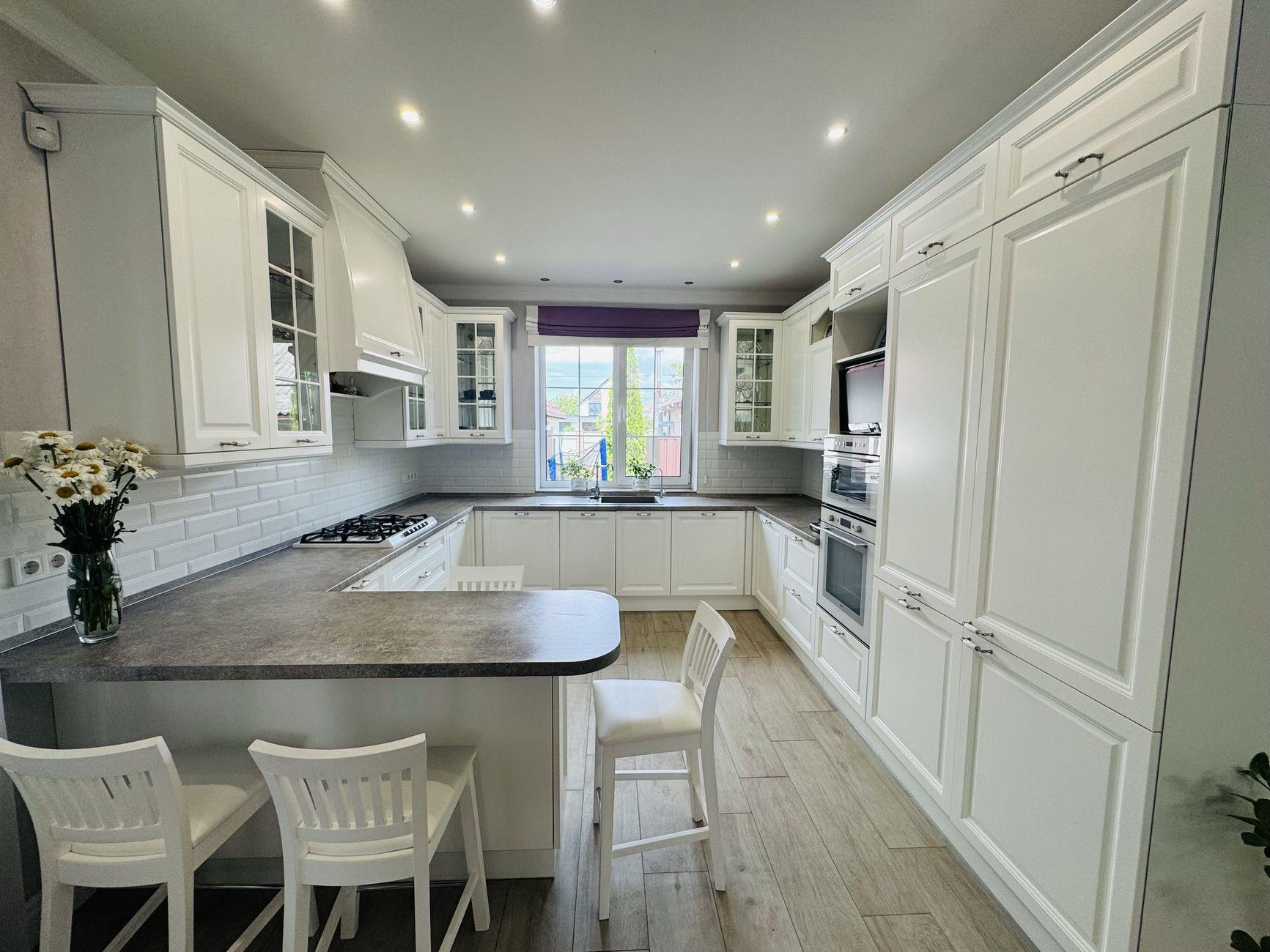 Загальна площа - 126 кв.м., велика кухня-студія з каміном, обладнана меблями і технікою провідних виробників (Merx, Smeg, Liebherr, Bosch, Whirlpool), 3 спальні кімнати, 2 с/в, гардеробна і котельня. Тераса з електричними ролетами з зоною барбекю.