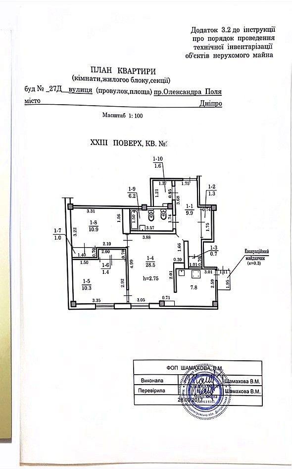 Загальна площа - 71,8 кв.м: кухня-їдальня 7,8кв.м.+ 28,5 кв.м., 2 окремі спальні кімнати 10,3кв.м./ 10,9кв.м., суміжний санвузол 6,2 кв.м., кладова кімната 1,6 кв.м., 4 вбудовані шафи 1,4кв.м./1,3 кв.м./1 кв.м./0,7кв.м., передпокій 9,9 кв.м., балкон 2 кв.м. Висота стелі 2,75м.